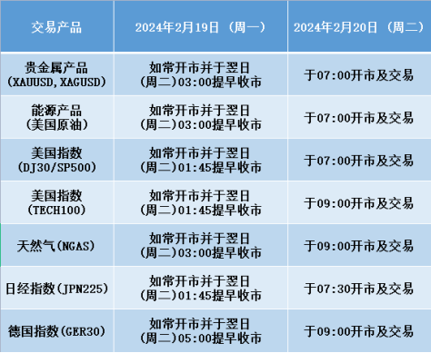 因应美国总统日假期 (2024年2月19日 周一),本公司以下产品的交易时间将于假期期间作以下安排,敬请留意。